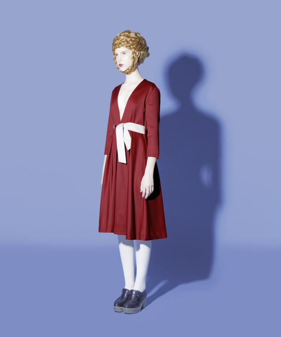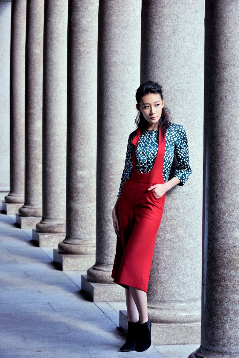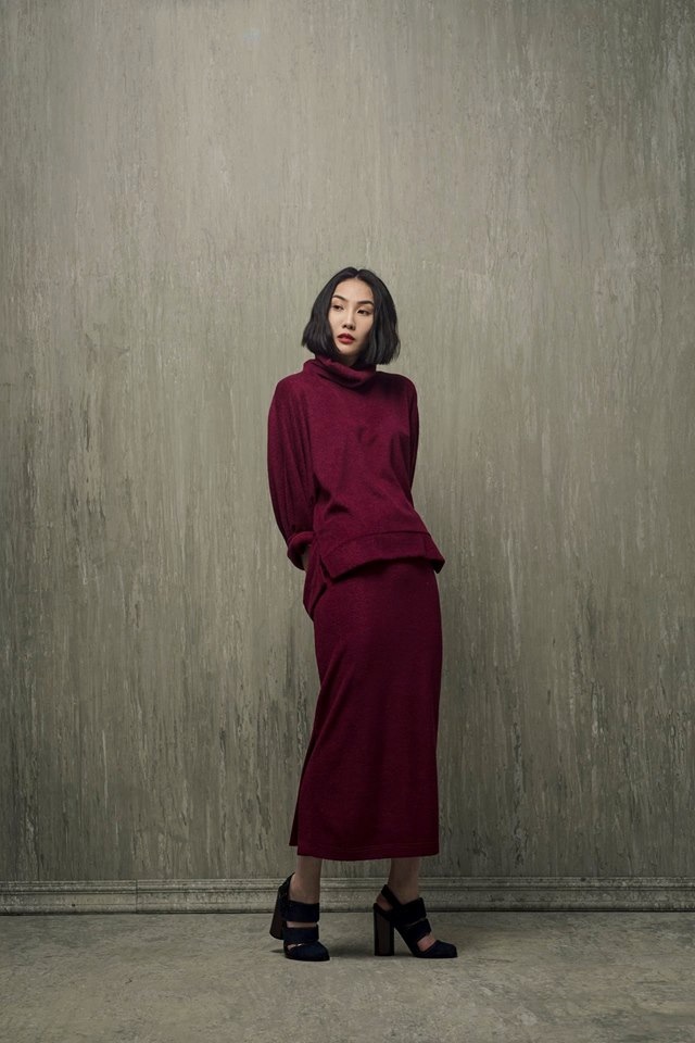 寬而高的上衣領子讓脖子更顯纖細,配上長裙則更為優雅。顏色選用了能更顯膚色白皙的酒紅色,且帶來一股成熟女子神秘而優雅的氣息。