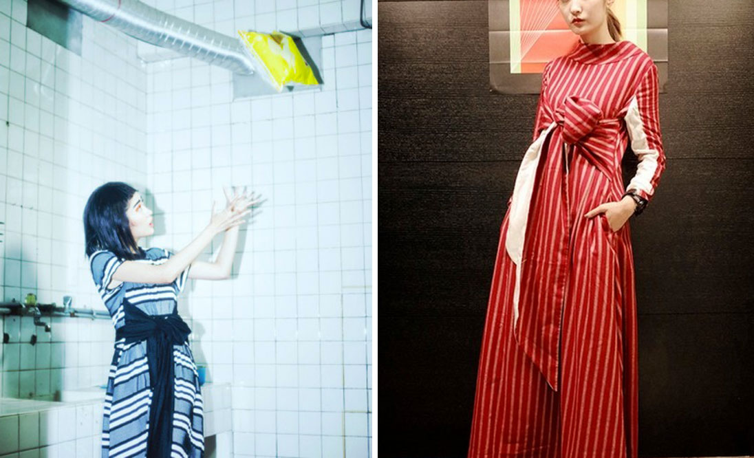 棗紅與白色的線條充滿現代感,立領的設計及洋裝長度更顯得身形的修長,仔細一看會發現這件洋裝處處都有特別的小設計,袖子及腰帶特別縫上的白色布料,腰際大大的蝴蝶結高調又醒目,綁帶的設計還能讓腰身被拉出來,是相當具設計感的一款洋裝。