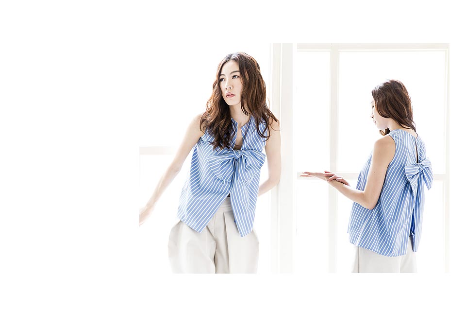 藍色與白色相間的線條給人一種清新的感覺,俐落的剪裁也多了知性的味道。扭轉的藍條紋蝴蝶結是這件服飾的一大亮點,蝴蝶結下方微微地露出腰部,更增添一絲女人味。從背後看,也有一個綁結點綴其中,彷彿有隻蝴蝶停在上面。