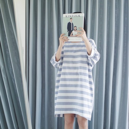這款條紋洋裝使用了較粗的藍白線條,更有一種慵懶休閒的味道,微寬的袖口及剪裁製造出日系可愛的氛圍,配上白布鞋,就是去野餐的標準搭配!