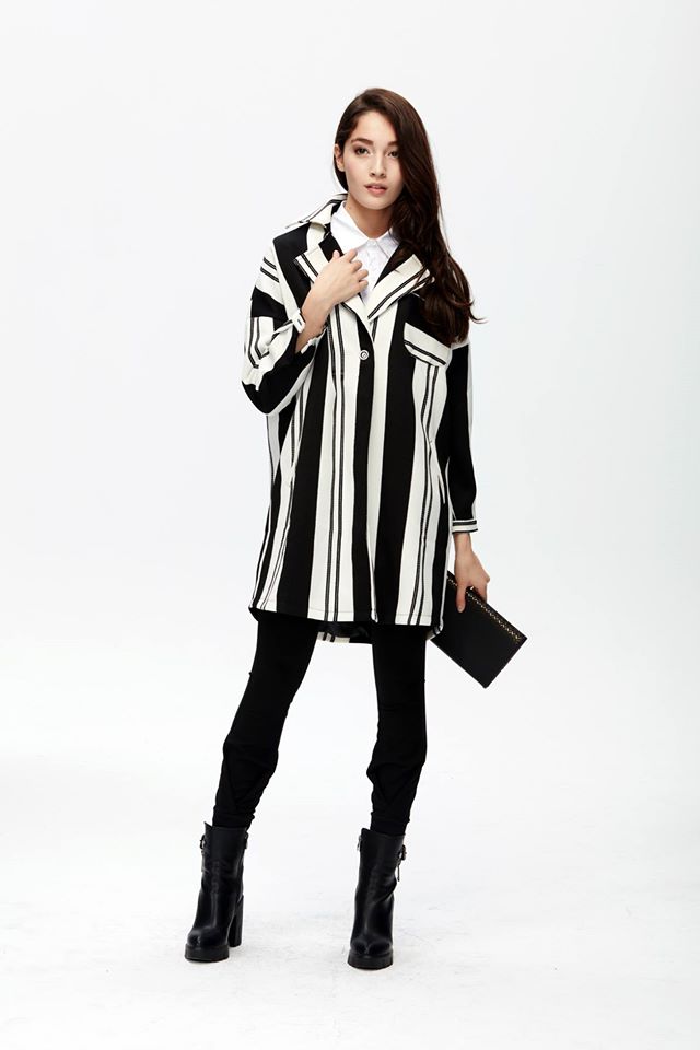 這款單品的條紋是比較特別的不規則形狀,運用黑白色的線條,看起來帥氣又俐落。中長版的長度不僅修飾身形,保暖效果也足夠。