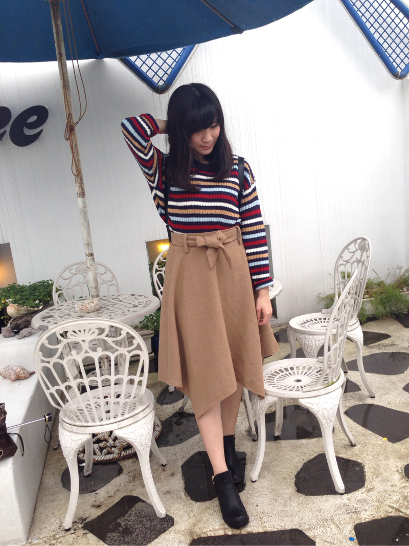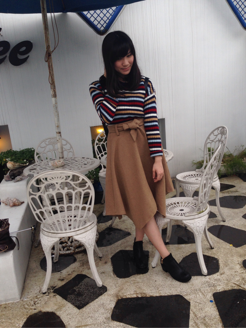 橫條毛衣穿起來舒適,搭配不規則長裙讓自己更修長!繫上簡單蝴蝶結腰帶🎀約會可以這樣穿喔😀