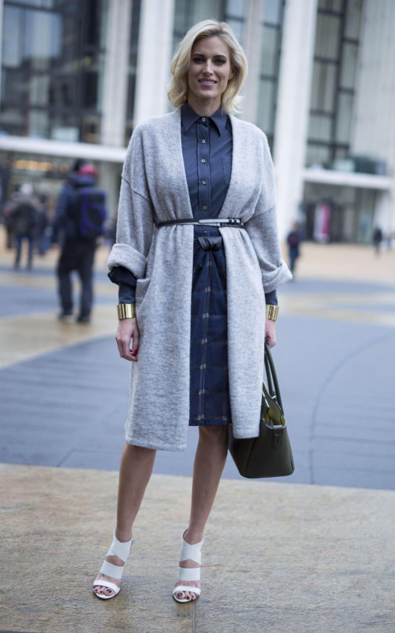 像我一樣的懶人們其實最怕就是要正式打扮的場合了,能躺就不坐的我們怎能忍受正式套裝的綁手綁腳呢!所以不想穿西裝外套時,開襟衫這樣看似比較休閒的單品,只要巧妙的運用配件,其實也能穿得正式喔。如圖中穿上一件襯衫式洋裝套一件開襟衫,重點就在那畫龍點睛的腰帶了,腰身一收起來馬上就能從休閒變幹練了!其實單穿一件簡約質料好的長版開襟衫,然後再紮上腰封穿上高跟鞋,也是時尚感滿點,正式又不拘謹的打扮喔!