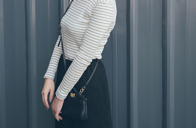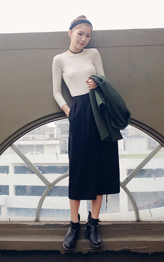 條紋式的合身長袖,配上黑色素面的高腰長裙,一雙高筒皮靴,在沒有過多的裝飾下,卻在整體的穿搭上塑造一股淡雅的氣息。