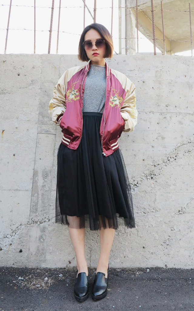 灰色的棉質上,配上飄逸的百褶薄紗,一雙亮面的皮鞋,呼應整體色調之餘,強烈的刺繡外套,不僅強調視覺效果,更為穿搭者帶來特色與個性。