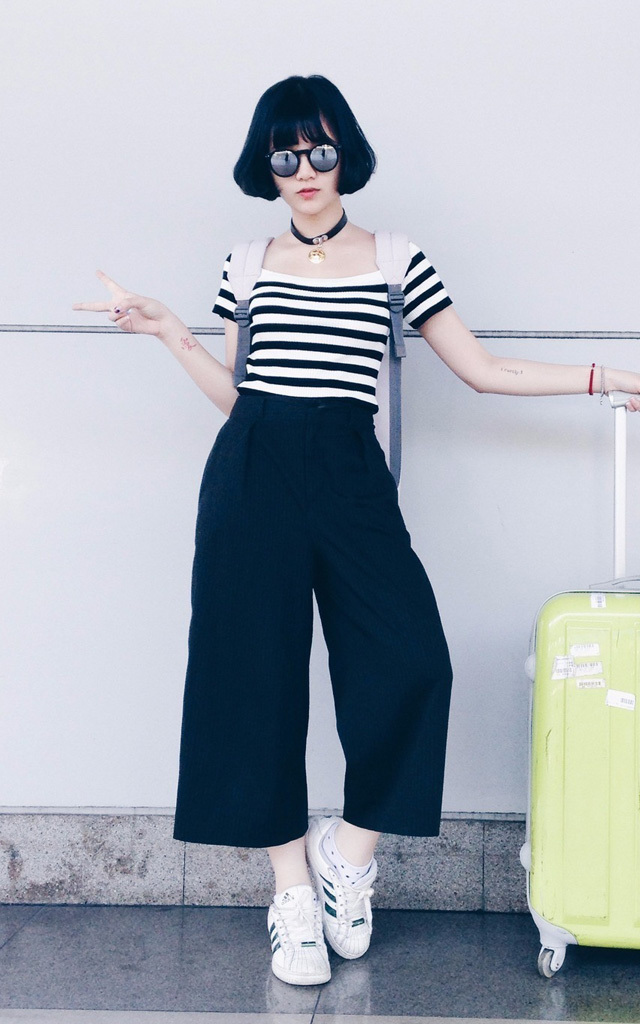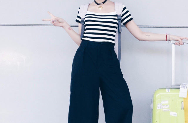 黑白橫條紋讓至於高腰的長褲更顯特色。