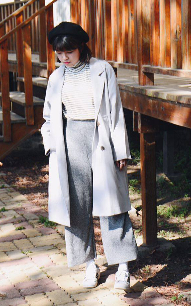 橫條的質感上衣,配下寬鬆的高腰長褲以及長版的大衣,在淺淺地色彩中,運用份量的加疊與層次技法,不僅提升穿搭上的豐富,也更加凸顯韻味。
