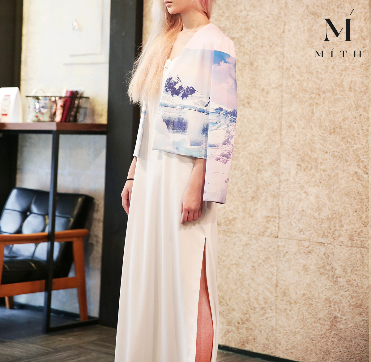 週末狂歡想在茫茫人群之中成為焦點嗎?那麼你一定不能錯過這一組混搭造型!潛水布材質短外套印上華麗的冰山圖騰,再搭配白色的開衩洋裝禮服,顏色舒適溫和又極具質感,還能小露一波性感美腿,別再懷疑了,冰山美人就是你!
