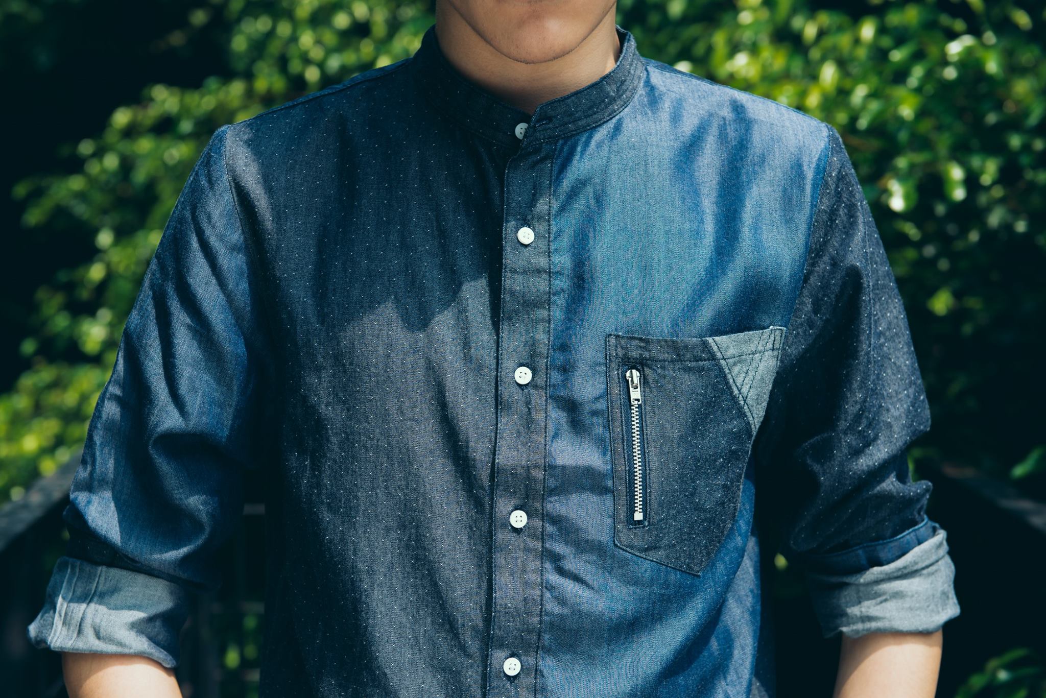 ▶ 上衣/denward/立領拼接襯衫 (黑X午夜藍) –男款
