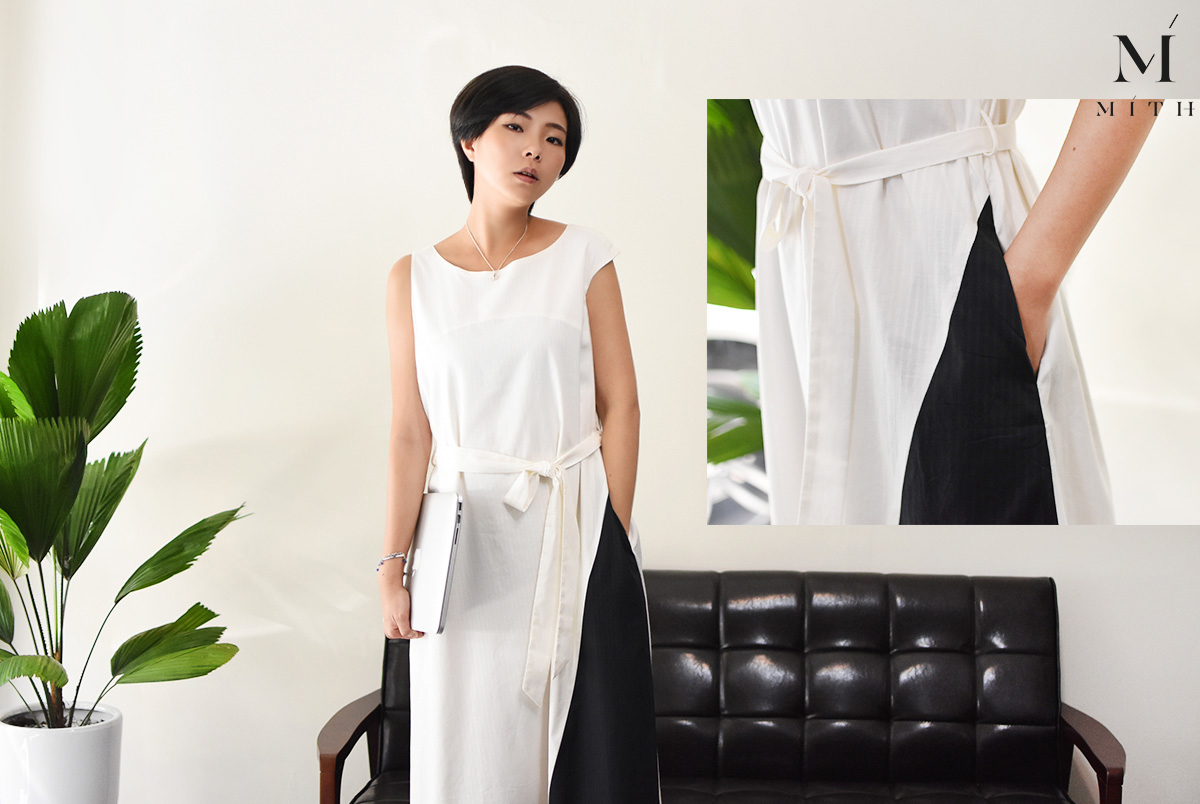 文字工作者給人氣質、文化底蘊深厚的印象,以白色來搭配能夠帶出脫俗的氣息,別於膝上洋裝,長版的洋裝設計,不僅多了側邊撞色的層次,表現了想法與創意感,而腰上的綁帶不僅修飾身材,還能讓整體更有一致性,左右袖子的微小設計,讓心思細膩的妳,擁有細節裡的奇妙巧思。