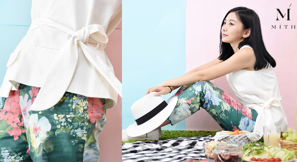 想到野餐,第一個會想到什麼呢?就是陽光與植物。室內野餐派對來點繽紛印花的設計吧!有別於以往對於花紋較為老氣的印象,西裝褲型的剪裁,搭配上大色塊的印花,突顯出獨特的品味,上衣、帽子、鞋子用白色搭配,能突顯出全身的重點又相互輝映。