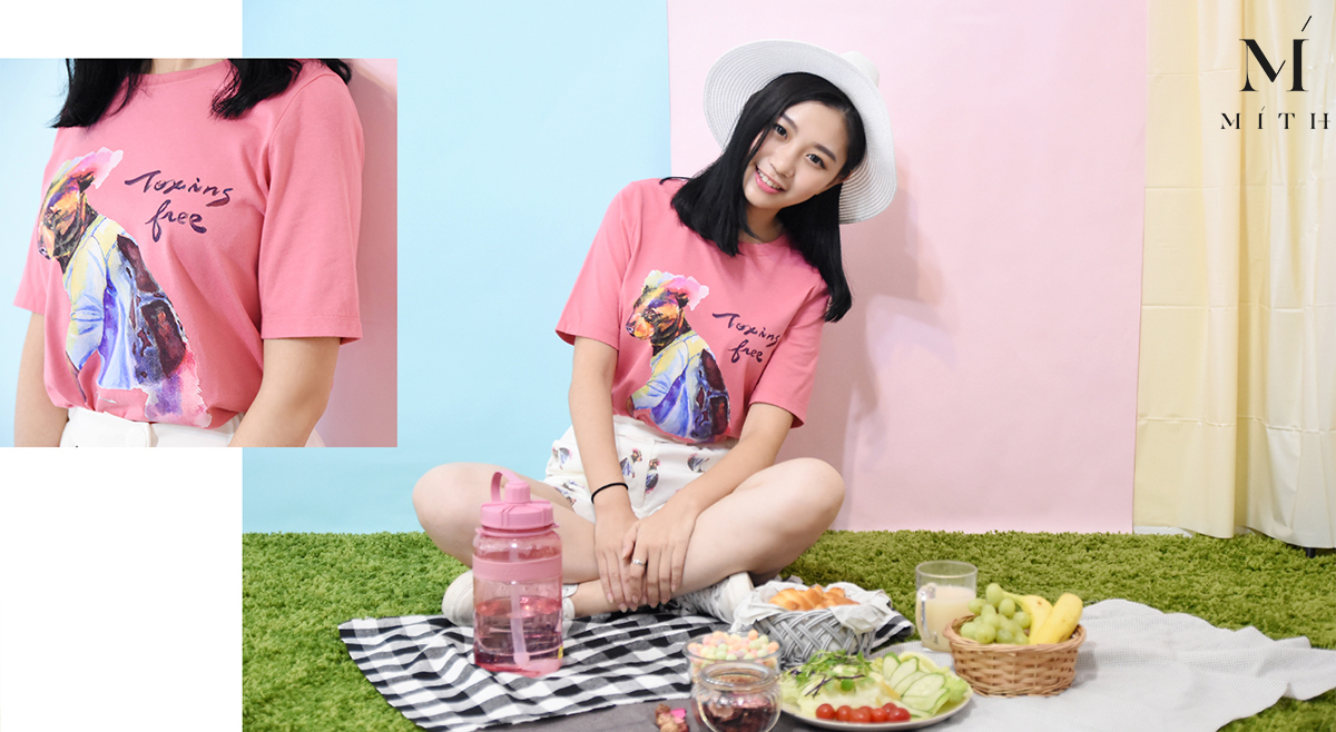 喜歡粉嫩色系的女孩們,可以選擇有特殊圖案的T-shirt搭配上一件較為寬鬆的短褲,不僅穿起來舒適有型,也很適合悠閒、放鬆的聚會,拋開平日裡較拘謹的衣著。而有機棉的面料不僅膚觸好,更是對地球友善的環保材質喔!