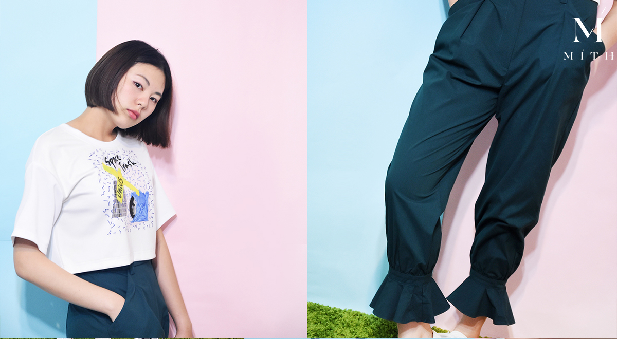 短版的上衣,一直是許多女生喜愛的單品,穿膩了素色的T-shirt那就來點顏色吧!一些不同的設計,能有畫龍點睛的效果喔!有別於對西裝褲版型的印象,這件褲管特殊的荷葉邊設計,在輕鬆的T-shirt穿搭中,加入有點女人味又獨特的設計。