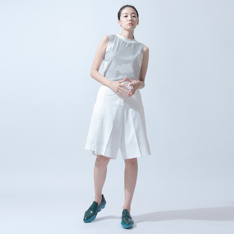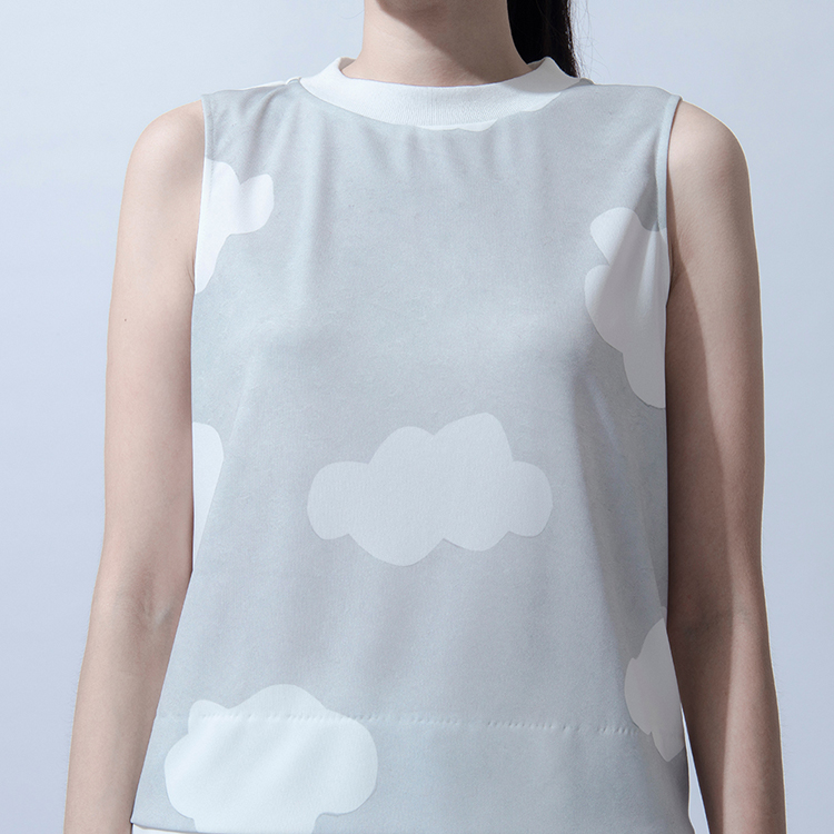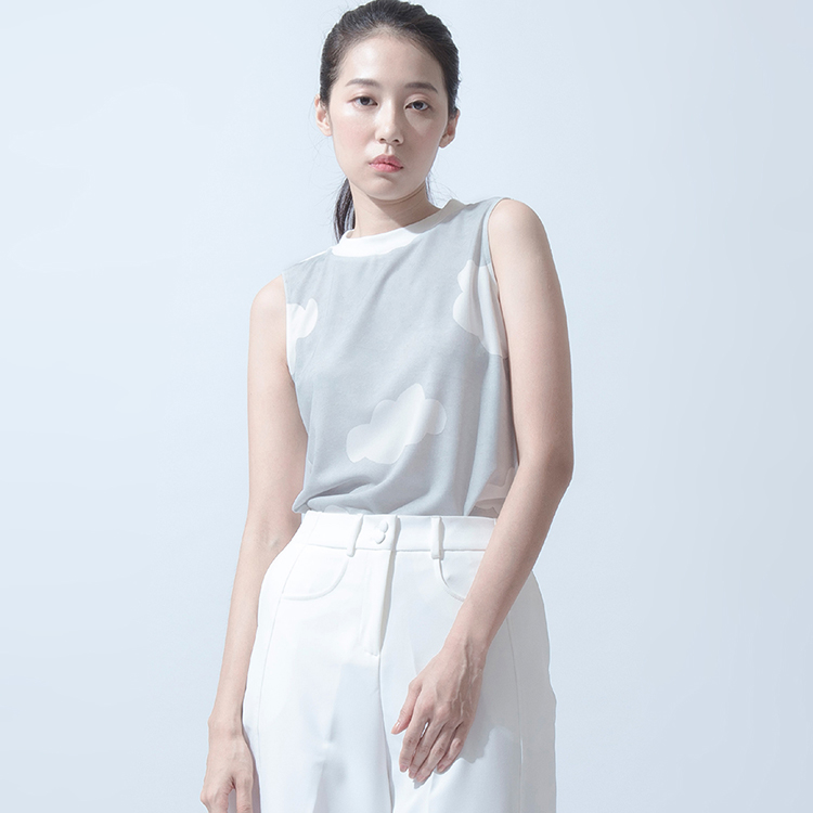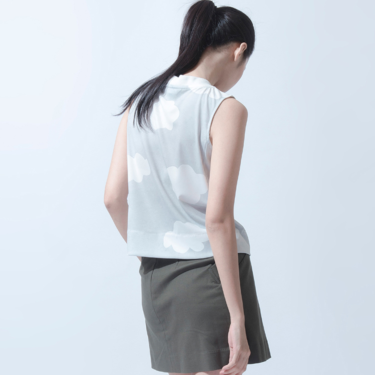 設計說明:寬鬆短上衣的版型,並取消側邊的剪接線,將收腰的份量移致後背,雖然偏中性但也不失女性線條。
