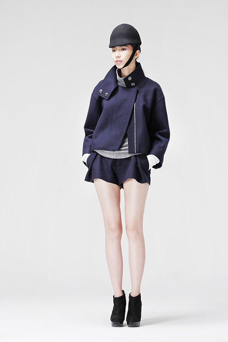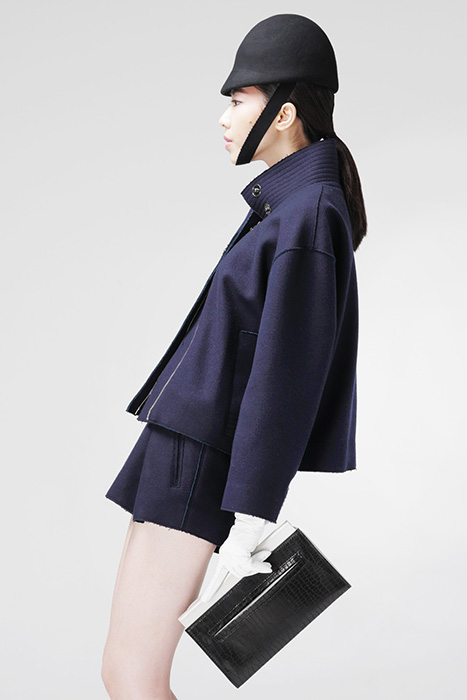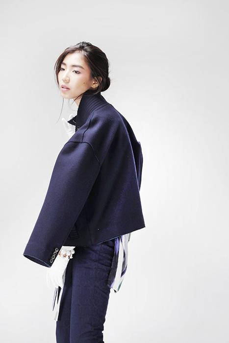 深藍色高領切邊外套