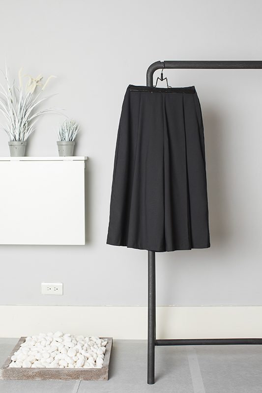 春夏に適切、スーツにも良く使われる素材を使う。ハイウエストにシルバーYKKサイドジップ。