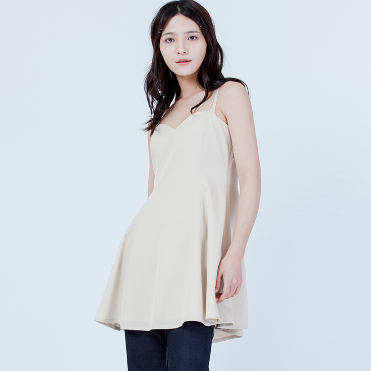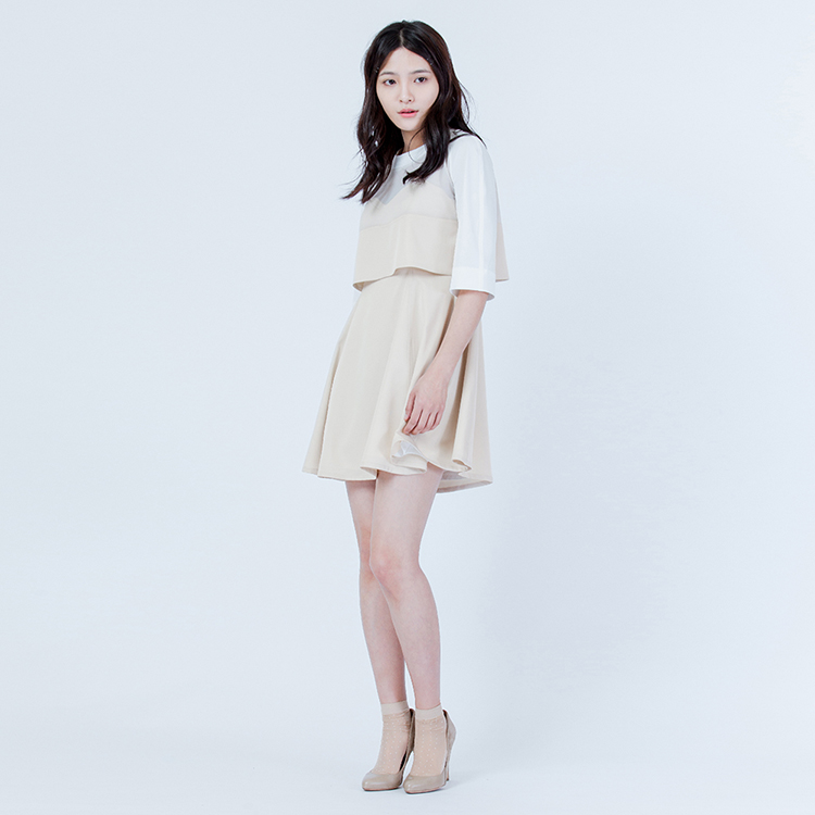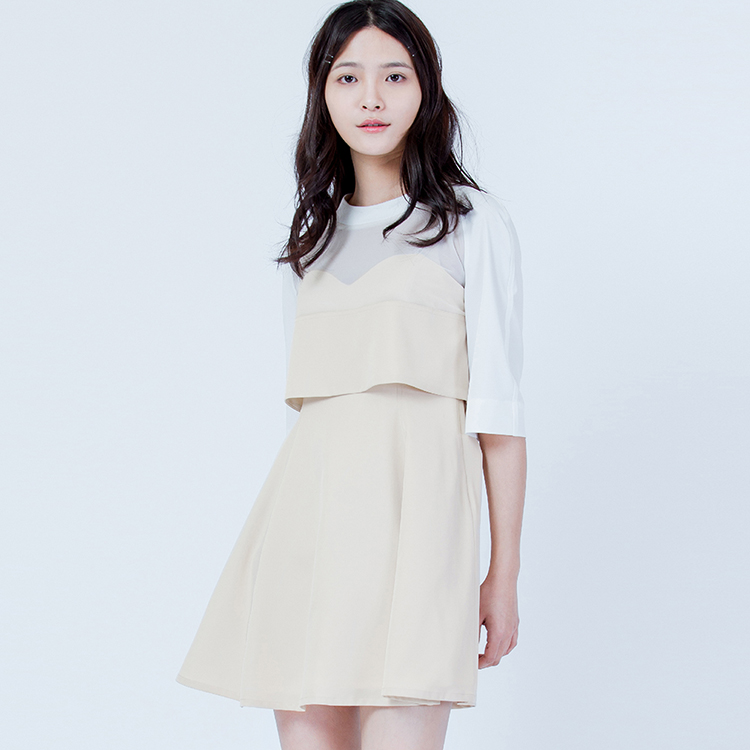版型設計:採用多層次穿搭風格:外層七分袖上衣,內層細肩帶洋裝。上衣的透明薄紗,可透視內層洋裝胸型,展現女子俏麗性感。