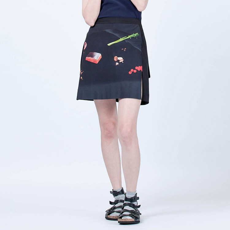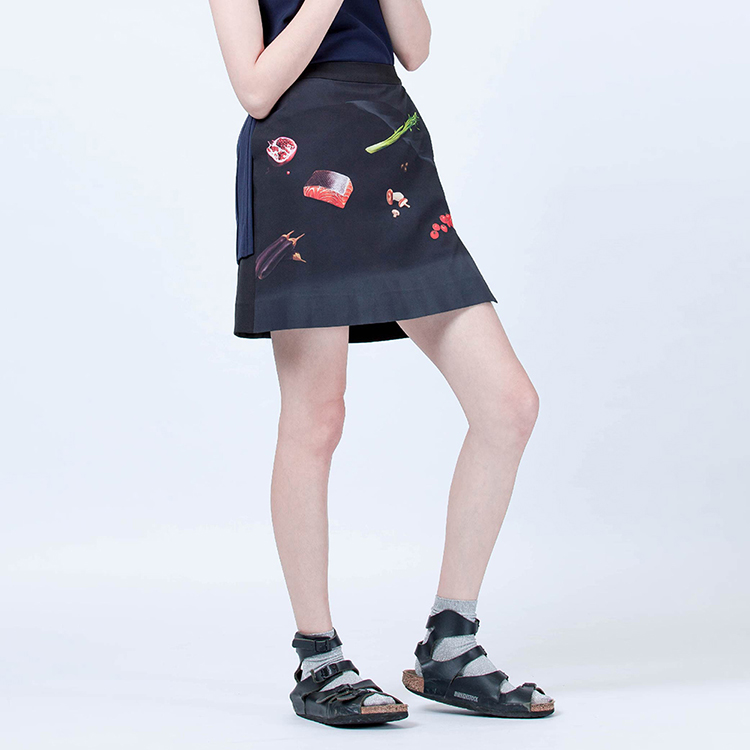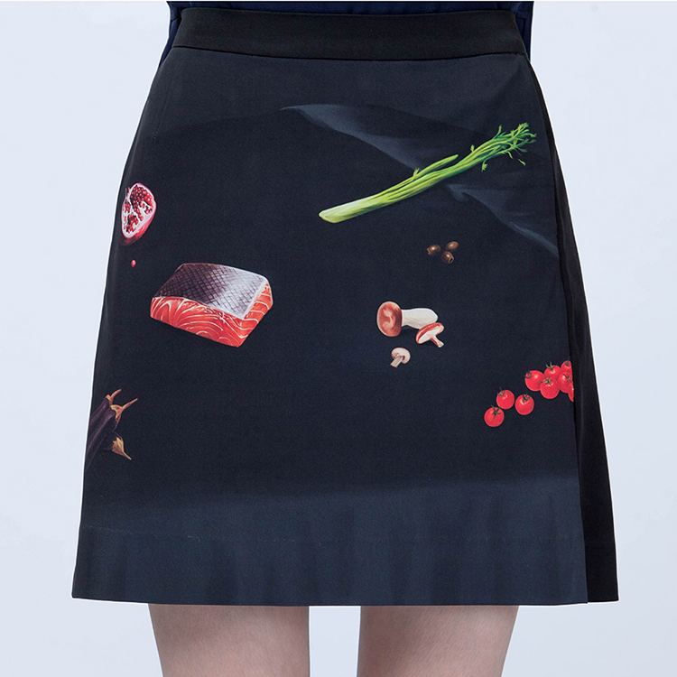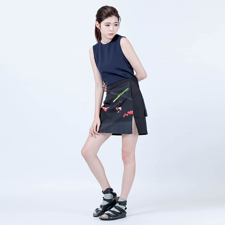簡式直筒短裙版型,收斂印花的裝飾效果變化,增加服裝的搭配性。