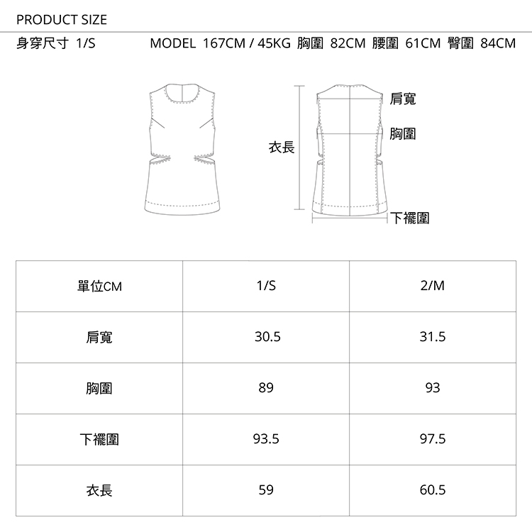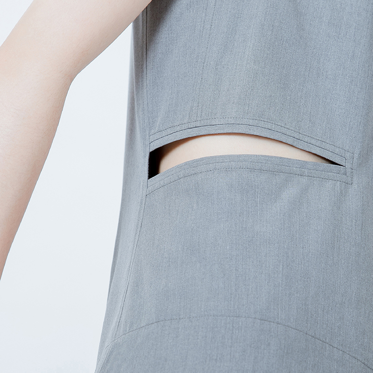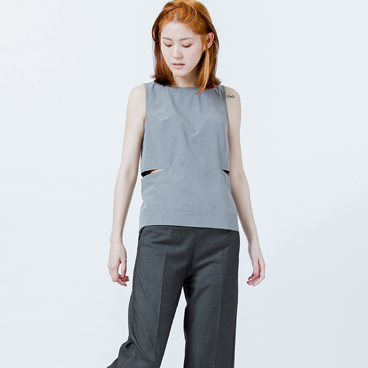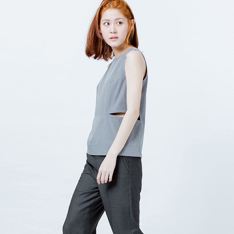 版型設計:背心剪裁與輕盈的麻灰色料,與圓中帶方的領型設計,為濕溽夏季標註上全新的趣味。