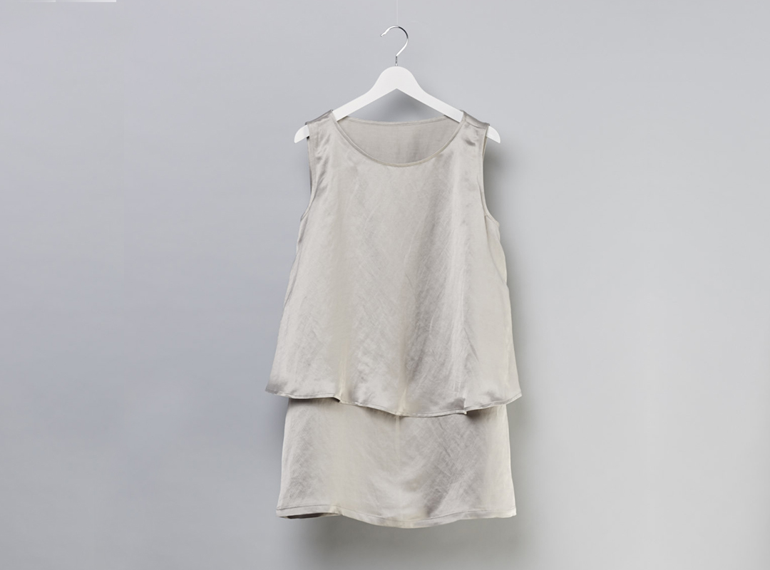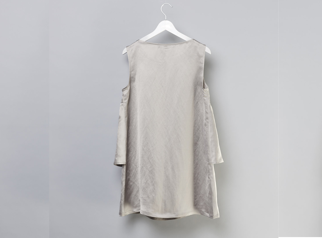 寬鬆剪裁洋裝,使用帶金屬光澤的布料。