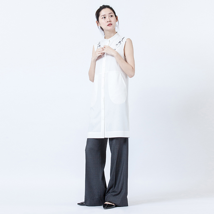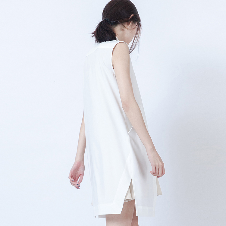 版型設計:設計以無袖長版襯衫為主體,放大的腰間口袋不僅俏皮,更成為視覺上的特殊線條。襯衫式的立領設計,與兩側下襬的特殊開衩設定,將原本單一預設的長板襯衫,轉化成單穿與外搭皆宜的設計單品,搭配性極高。